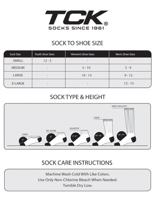 TCK was founded in 1961 in North Carolina. They began knitting performance team athletic socks and quickly established themselves as the industry leader in the team market. TCK now produces socks for every person and every occasion. TCK still manufacture the majority of their socks in North Carolina. When purchasing TCK products, you can feel proud to support a USA based company that directly supports American employees.
