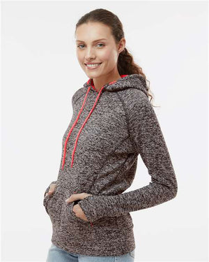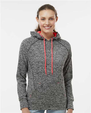 J. America 8616 Women’s Cosmic Fleece Hooded Sweatshirt - Charcoal Fleck Fire Coral