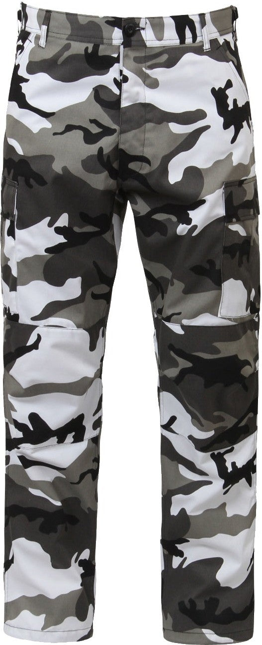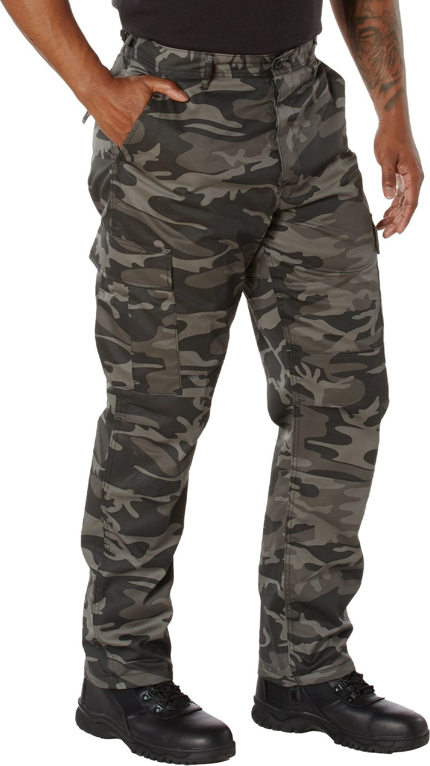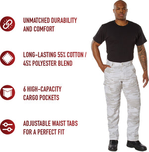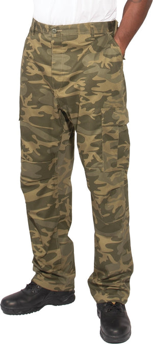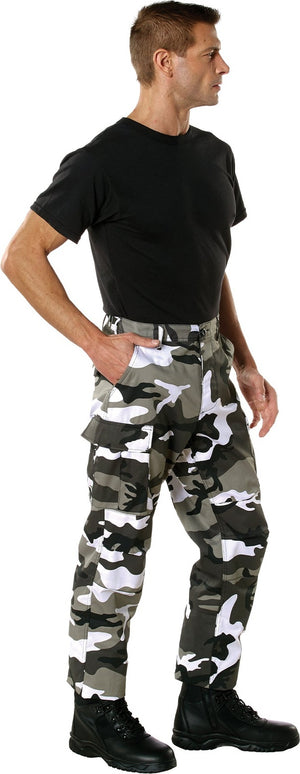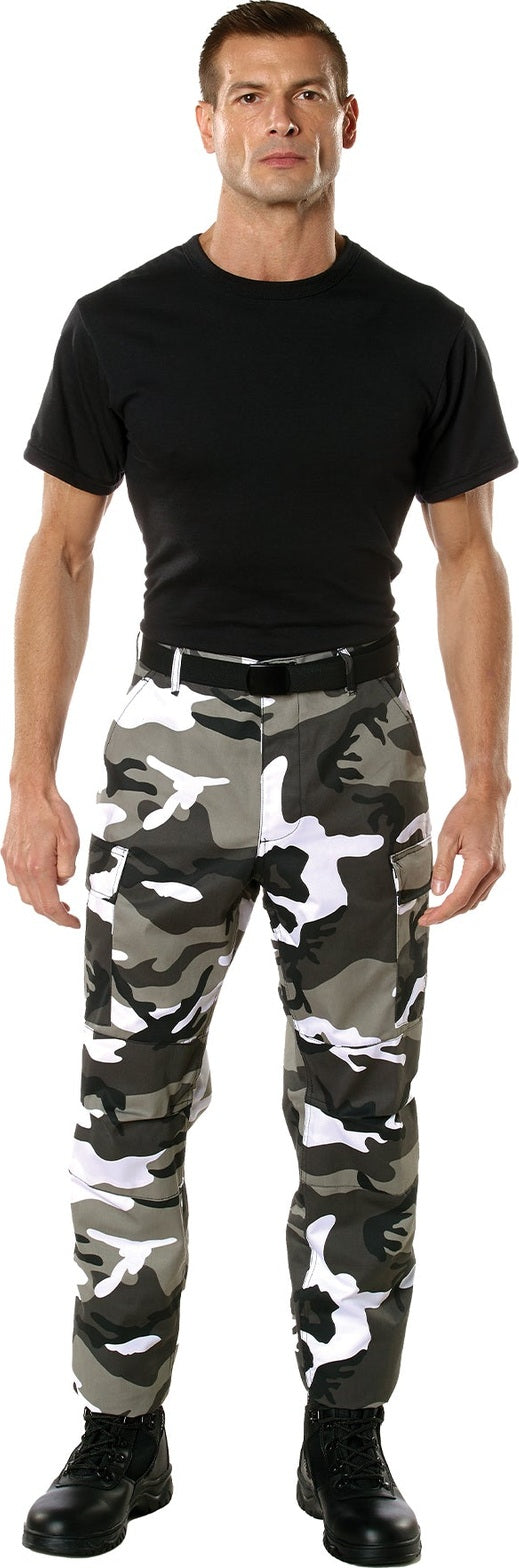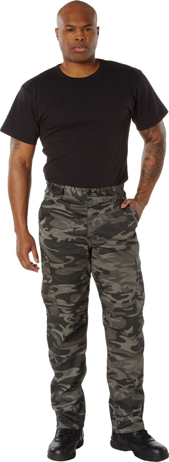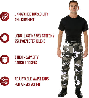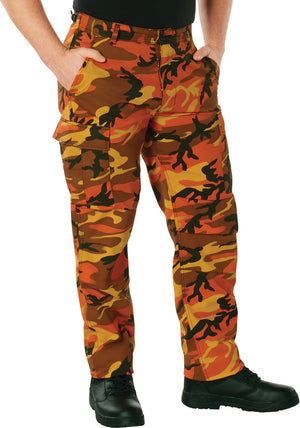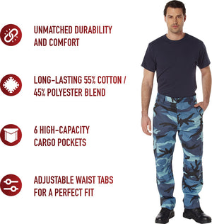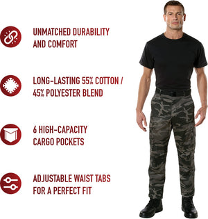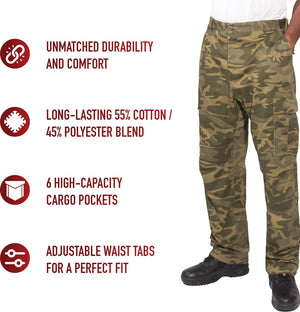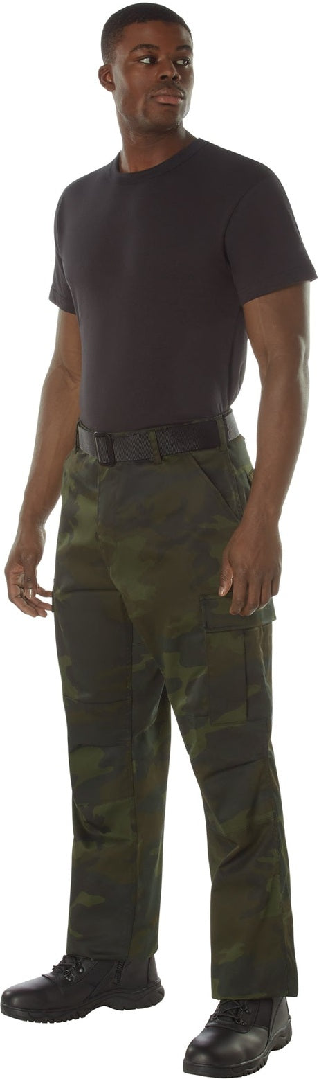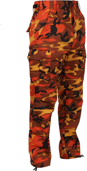Experience over 4 decades of trusted design with our Color Camo Tactical BDU Pants. Constructed from a robust cotton / polyester fabric blend, these military cargo pants are built for unparalleled performance and comfort. Providing flexibility, strength, and plenty of pockets, these BDUs are not afraid to get down and dirty, standing up to tough challenges during field missions, tactical operations, law enforcement duties, and outdoor adventures. Tried-and-True Reliability: These tactical military uniform pants are reinforced in the seat and knees for maximum durability that endures wear and tear while supporting a full range of motion. The wear-resistant double-stitched seams provide extra strength and years of reliable use as you train, ruck, sprint, hike, and climb. High-Capacity Cargo Pockets: The camouflage EDC cargo pants provide functional utility through a spacious 6 pocket design that consists of 2 large button-down cargo pockets, 2 front slash pockets, and 2 button-down back pockets for storing tactical gear or everyday essentials like your phone, wallet, keys, or multi-tool. Utility at the Forefront: These tactical camo hiking pants feature adjustable waist tabs that enable the perfect fit. In addition, the straight leg opening fits over boots comfortably while the drawstring ankle ties allow you to easily adjust the fit. These military BDU cargo pants utilize a button closure and fly. Action Ready: Initially designed for military personnel and tactical professionals, these adaptable and reliable tactical cargo pants are great for backpacking, camping, hiking, hunting, fishing, working, public safety, skateboarding, everyday wear, and more.