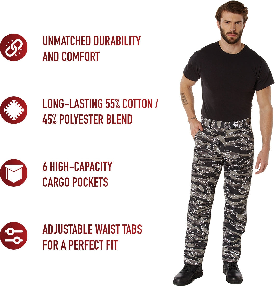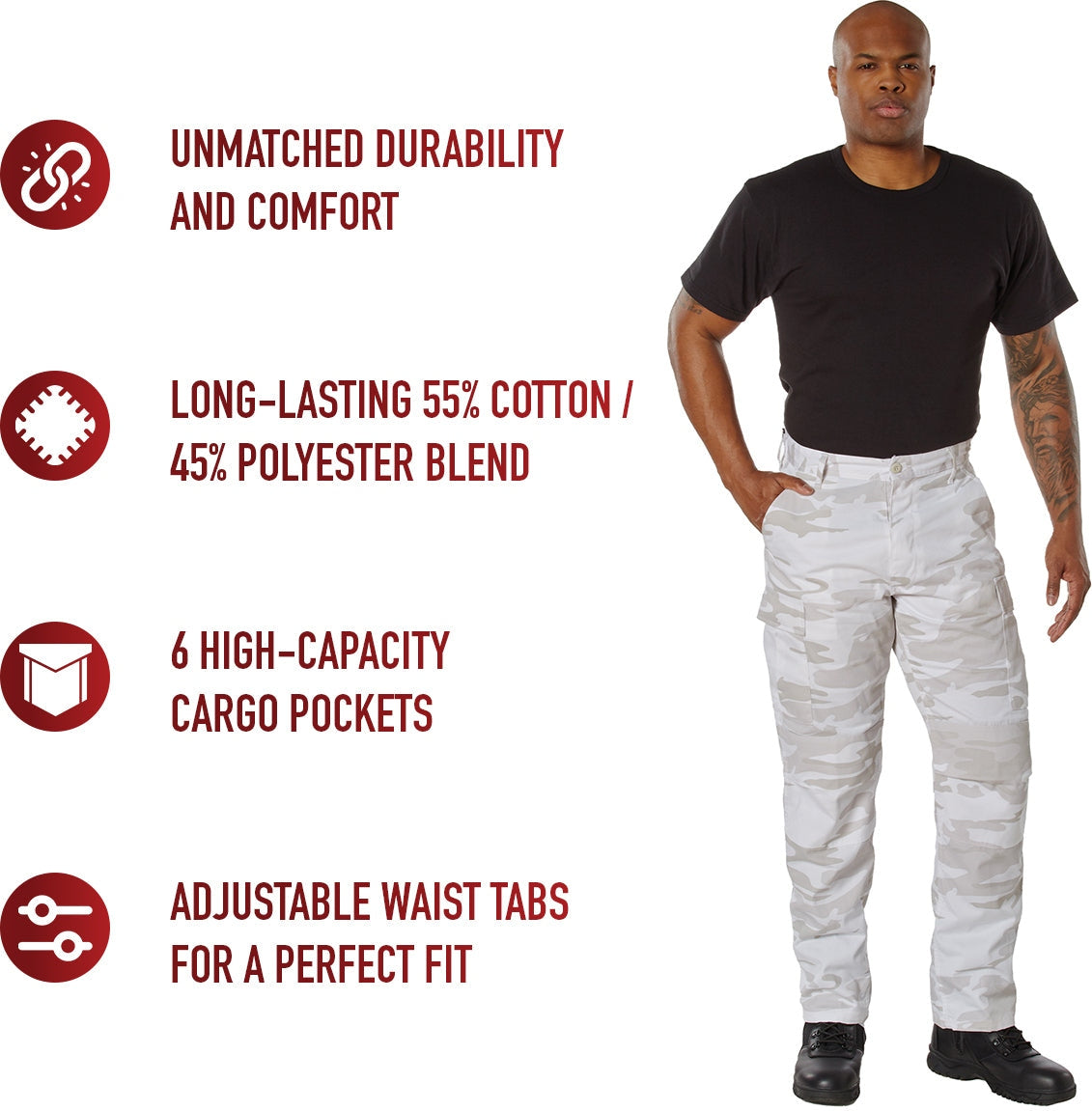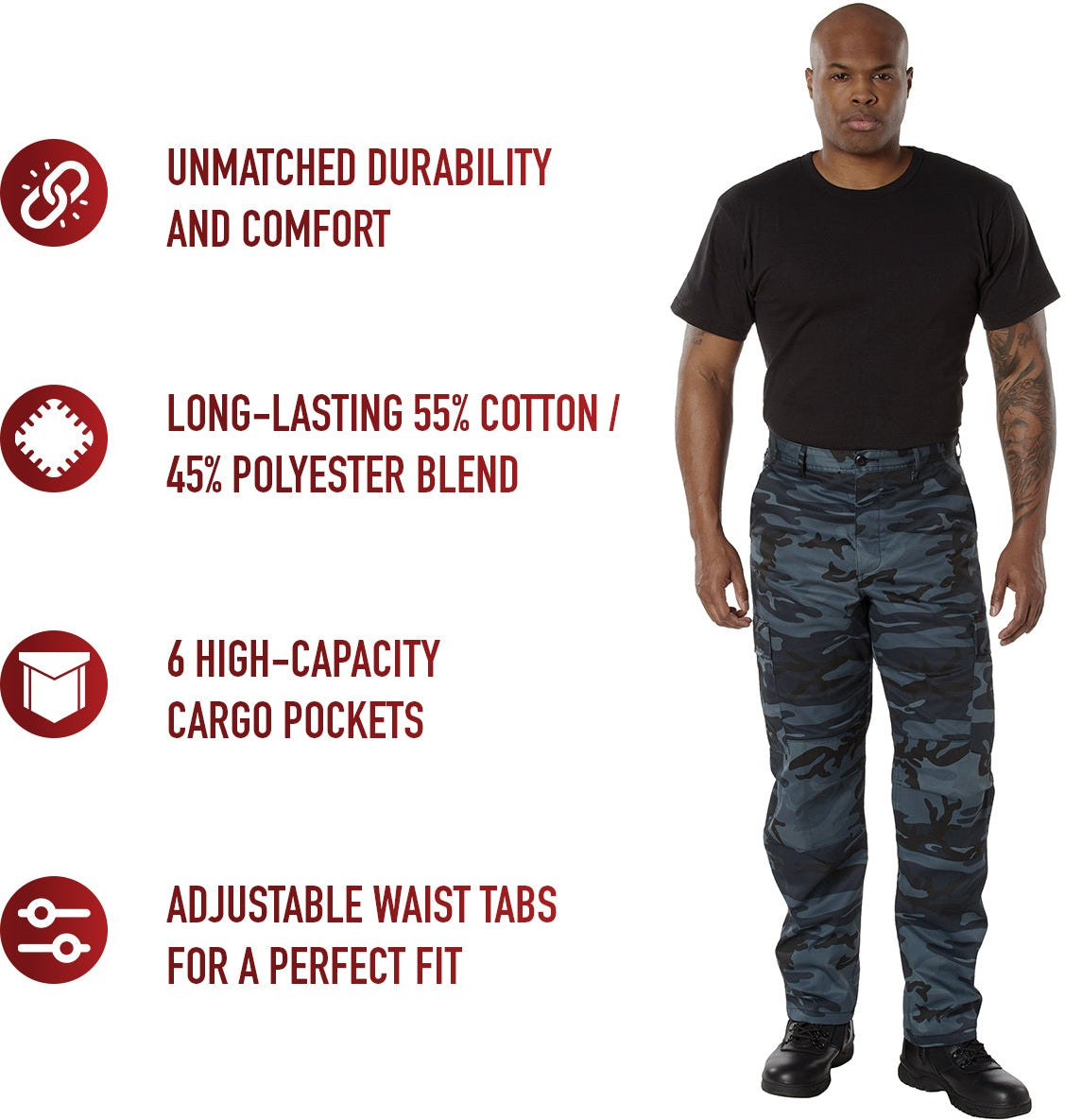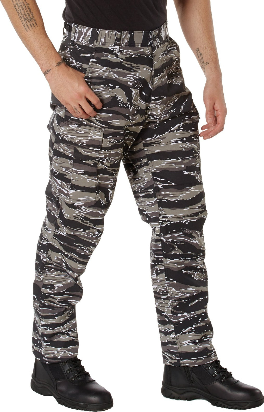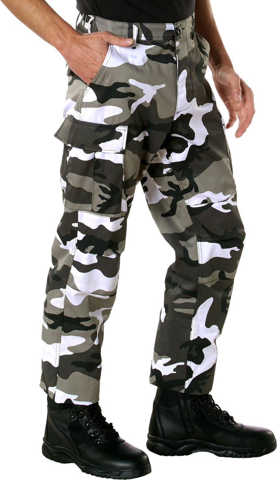 Experience over 4 decades of trusted design with our Color Camo Tactical BDU Pants. Constructed from a robust cotton / polyester fabric blend, these military cargo pants are built for unparalleled performance and comfort. Providing flexibility, strength, and plenty of pockets, these BDUs are not afraid to get down and dirty, standing up to tough challenges during field missions, tactical operations, law enforcement duties, and outdoor adventures. Tried-and-True Reliability: These tactical military uniform pants are reinforced in the seat and knees for maximum durability that endures wear and tear while supporting a full range of motion. The wear-resistant double-stitched seams provide extra strength and years of reliable use as you train, ruck, sprint, hike, and climb. High-Capacity Cargo Pockets: The camouflage EDC cargo pants provide functional utility through a spacious 6 pocket design that consists of 2 large button-down cargo pockets, 2 front slash pockets, and 2 button-down back pockets for storing tactical gear or everyday essentials like your phone, wallet, keys, or multi-tool. Utility at the Forefront: These tactical camo hiking pants feature adjustable waist tabs that enable the perfect fit. In addition, the straight leg opening fits over boots comfortably while the drawstring ankle ties allow you to easily adjust the fit. These military BDU cargo pants utilize a button closure and fly. Action Ready: Initially designed for military personnel and tactical professionals, these adaptable and reliable tactical cargo pants are great for backpacking, camping, hiking, hunting, fishing, working, public safety, skateboarding, everyday wear, and more.