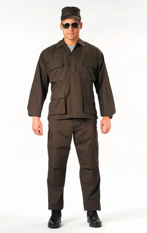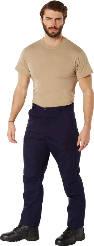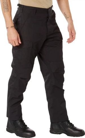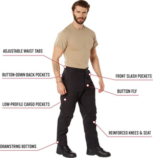 Experience over 4 decades of trusted design with our SWAT Cloth Tactical BDU Pants. Built from durable polyester / cotton rip-stop, our BDU pants provide unparalleled performance, breathability, durability, and lightweight comfort. These BDUs are not afraid to get down and dirty, standing up to field missions, tactical operations, law enforcement duties, and outdoor adventures. Tried-and-True Reliability: These tactical military uniform pants are reinforced in the seat and knees for maximum durability that endures wear and tear while supporting a full range of motion. The wear-resistant double-stitched seams provide extra strength and years of reliable use as you train, ruck, sprint, hike, and climb. High-Capacity Cargo Pockets: The EDC cargo pants provide functional utility through a spacious 6 pocket design that consists of 2 button-down pleated low-profile cargo pockets, 2 front slash pockets, and 2 button-down back pockets for storing tactical gear or everyday essentials like your phone, wallet, keys, or multi-tool. Utility at the Forefront: These tactical hiking pants feature adjustable waist tabs that enable the perfect fit. In addition, the straight leg opening fits over boots comfortably while the drawstring ankle ties allow you to easily adjust the fit. These military BDU cargo pants utilize a button closure and fly. Action Ready: Initially designed for military personnel and tactical professionals, these adaptable and reliable tactical cargo pants are great for backpacking, camping, hiking, hunting, fishing, working, public safety, skateboarding, everyday wear, and more.